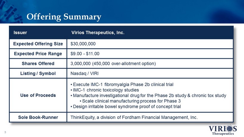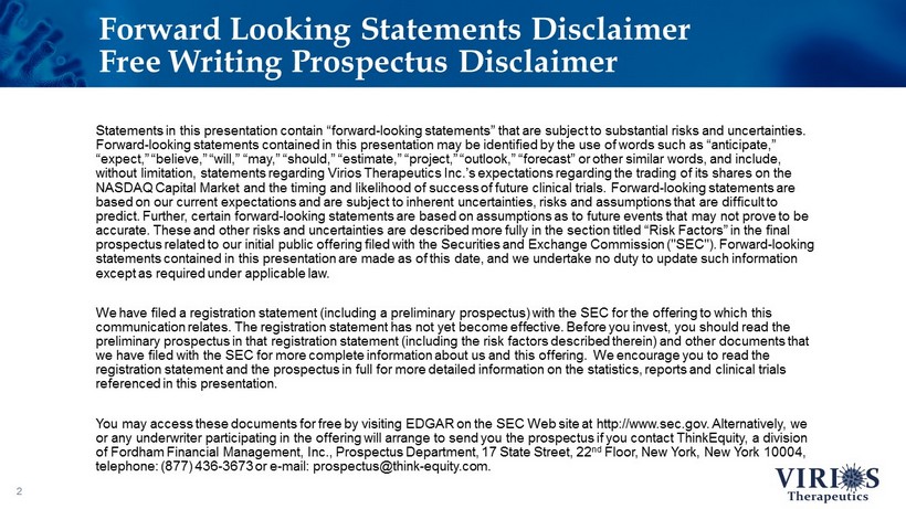 Statements in this presentation contain “forward - looking statements” that are subject to substantial risks and uncertainties. Forward - looking statements contained in this presentation may be identified by the use of words such as “anticipate,” “expect,” “believe,” “will,” “may,” “should,” “estimate,” “project,” “outlook,” “forecast” or other similar words, and includ e, without limitation, statements regarding Virios Therapeutics Inc.’s expectations regarding the trading of its shares on the NASDAQ Capital Market and the timing and likelihood of success of future clinical trials. Forward - looking statements are based on our current expectations and are subject to inherent uncertainties, risks and assumptions that are difficult to predict. Further, certain forward - looking statements are based on assumptions as to future events that may not prove to be accurate. These and other risks and uncertainties are described more fully in the section titled “Risk Factors” in the final prospectus related to our initial public offering filed with the Securities and Exchange Commission ("SEC"). Forward - looking statements contained in this presentation are made as of this date, and we undertake no duty to update such information except as required under applicable law. We have filed a registration statement (including a preliminary prospectus) with the SEC for the offering to which this communication relates. The registration statement has not yet become effective. Before you invest, you should read the preliminary prospectus in that registration statement (including the risk factors described therein) and other documents that we have filed with the SEC for more complete information about us and this offering. We encourage you to read the registration statement and the prospectus in full for more detailed information on the statistics, reports and clinical trials referenced in this presentation. You may access these documents for free by visiting EDGAR on the SEC Web site at http://www.sec.gov. Alternatively, we or any underwriter participating in the offering will arrange to send you the prospectus if you contact ThinkEquity , a division of Fordham Financial Management, Inc., Prospectus Department, 17 State Street, 22 nd Floor, New York, New York 10004, telephone: (877) 436 - 3673 or e - mail: prospectus@think - equity.com. Forward Looking Statements Disclaimer Free Writing Prospectus Disclaimer 2