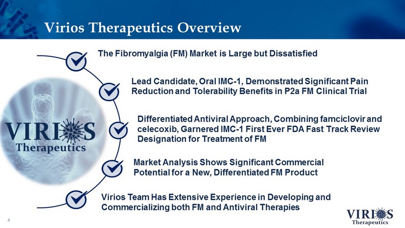 Offering Summary 3 Issuer Virios Therapeutics, Inc. Expected Offering Size $30,000,000 Expected Price Range $9.00 - $11.00 Shares Offered 3,000,000 (450,000 over - allotment option) Listing / Symbol Nasdaq / VIRI Use of Proceeds • Execute IMC - 1 fibromyalgia Phase 2b clinical trial • IMC - 1 chronic toxicology studies • Manufacture investigational drug for the Phase 2b study & chronic tox study • Scale clinical manufacturing process for Phase 3 • Design irritable bowel syndrome proof of concept trial Sole Book - Runner ThinkEquity, a division of Fordham Financial Management, Inc.