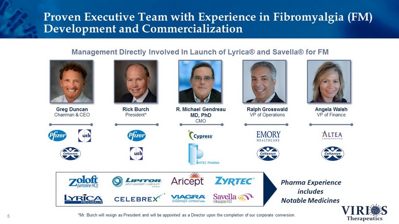 Virios Therapeutics Overview 4 The Fibromyalgia (FM) Market is Large but Dissatisfied Lead Candidate, Oral IMC - 1, Demonstrated Significant Pain Reduction and Tolerability Benefits in P2a FM Clinical Trial Market Analysis Shows Significant Commercial Potential for a New, Differentiated FM Product Virios Team Has Extensive Experience in Developing and Commercializing both FM and Antiviral Therapies Differentiated Antiviral Approach, Combining famciclovir and celecoxib, Garnered IMC - 1 First Ever FDA Fast Track Review Designation for Treatment of FM