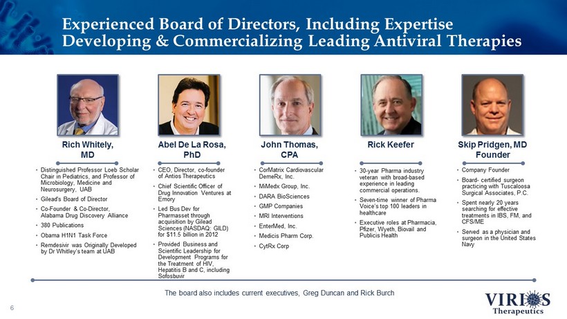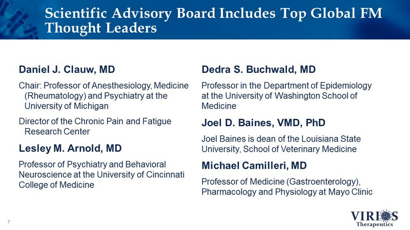 Experienced Board of Directors, Including Expertise Developing & Commercializing Leading Antiviral Therapies 6 Rich Whitely, MD Abel De La Rosa, PhD John Thomas, CPA Rick Keefer Skip Pridgen, MD Founder • Distinguished Professor Loeb Scholar Chair in Pediatrics, and Professor of Microbiology, Medicine and Neurosurgery, UAB • Gilead's Board of Director • Co - Founder & Co - Director, Alabama Drug Discovery Alliance • 380 Publications • Obama H1N1 Task Force • Remdesivir was Originally Developed by Dr Whitley’s team at UAB • CEO, Director, co - founder of Antios Therapeutics • Chief Scientific Officer of Drug Innovation Ventures at Emory • Led Bus Dev for Pharmasset through acquisition by Gilead Sciences (NASDAQ: GILD) for $11.5 billion in 2012 • Provided Business and Scientific Leadership for Development Programs for the Treatment of HIV, Hepatitis B and C, including Sofosbuvir • CorMatrix Cardiovascular DemeRx , Inc. • MiMedx Group, Inc. • DARA BioSciences • GMP Companies • MRI Interventions • EnterMed, Inc. • Medicis Pharm Corp. • CytRx Corp • 30 - year Pharma industry veteran with broad - based experience in leading commercial operations. • Seven - time winner of Pharma Voice’s top 100 leaders in healthcare • Executive roles at Pharmacia, Pfizer, Wyeth, Biovail and Publicis Health • Company Founder • Board - certified surgeon practicing with Tuscaloosa Surgical Associates, P.C. • Spent nearly 20 years searching for effective treatments in IBS, FM, and CFS/ME • Served as a physician and surgeon in the United States Navy The board also includes current executives, Greg Duncan and Rick Burch