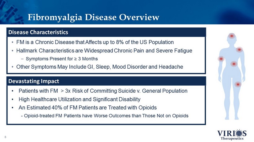 Scientific Advisory Board Includes Top Global FM Thought Leaders 7 Daniel J. Clauw, MD Chair: Professor of Anesthesiology, Medicine (Rheumatology) and Psychiatry at the University of Michigan Director of the Chronic Pain and Fatigue Research Center Lesley M. Arnold, MD Professor of Psychiatry and Behavioral Neuroscience at the University of Cincinnati College of Medicine Dedra S. Buchwald, MD Professor in the Department of Epidemiology at the University of Washington School of Medicine Joel D. Baines, VMD, PhD Joel Baines is dean of the Louisiana State University, School of Veterinary Medicine Michael Camilleri, MD Professor of Medicine (Gastroenterology), Pharmacology and Physiology at Mayo Clinic