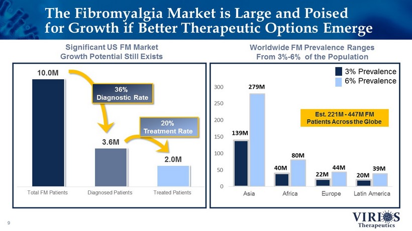 Fibromyalgia Disease Overview 8 • FM is a Chronic Disease that Affects up to 8% of the US Population • Hallmark Characteristics are Widespread Chronic Pain and Severe Fatigue – Symptoms Present for ≥ 3 Months • Other Symptoms May Include GI, Sleep, Mood Disorder and Headache Devastating Impact • Patients with FM > 3x Risk of Committing Suicide v. General Population • High Healthcare Utilization and Significant Disability • An Estimated 40% of FM Patients are Treated with Opioids - Opioid - treated FM Patients have Worse Outcomes than Those Not on Opioids Disease Characteristics