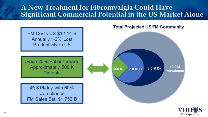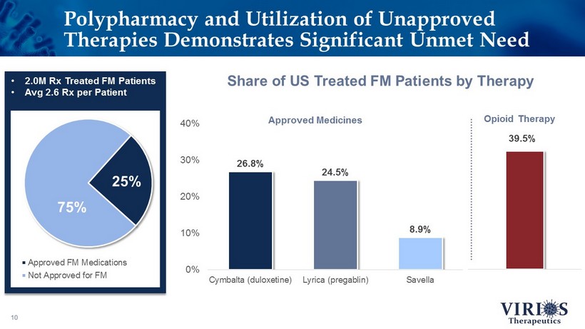 Polypharmacy and Utilization of Unapproved Therapies Demonstrates Significant Unmet Need 10 Approved FM Medications Not Approved for FM 75% 25% 26.8% 24.5% 8.9% 0% 10% 20% 30% 40% Cymbalta (duloxetine) Lyrica (pregablin) Savella Approved Medicines 39.5% Opioid Therapy • 2.0M Rx Treated FM Patients • Avg 2.6 Rx per Patient Share of US Treated FM Patients by Therapy