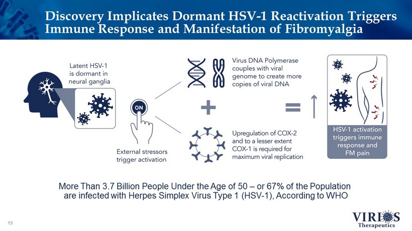 Discovery Implicates Dormant HSV - 1 Reactivation Triggers Immune Response and Manifestation of Fibromyalgia 13 More Than 3.7 Billion People Under the Age of 50 – or 67% of the Population are infected with Herpes Simplex Virus Type 1 (HSV - 1), According to WHO