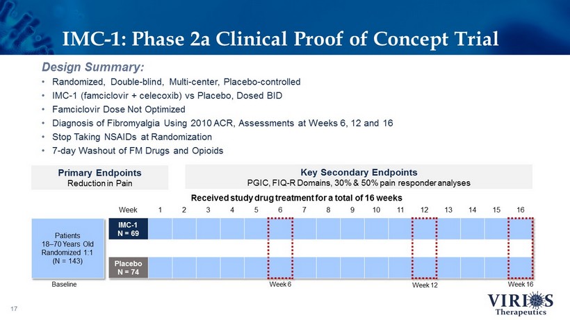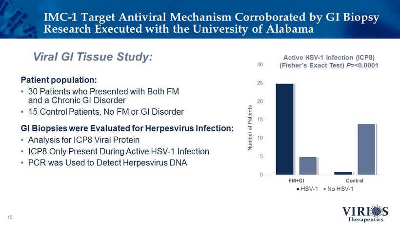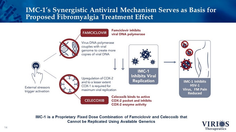 IMC - 1’s Synergistic Antiviral Mechanism Serves as Basis for Proposed Fibromyalgia Treatment Effect 14 IMC - 1 is a Proprietary Fixed Dose Combination of Famciclovir and Celecoxib that Cannot be Replicated Using Available Generics IMC - 1 Inhibits HSV - 1 Virus, FM Pain Reduced