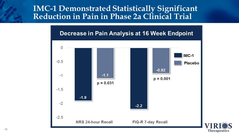 Week 1 2 3 4 5 6 7 8 9 10 11 12 13 14 15 16 IMC - 1 N = 69 Placebo N = 74 17 Design Summary: • Randomized, Double - blind, Multi - center, Placebo - controlled • IMC - 1 (famciclovir + celecoxib) vs Placebo, Dosed BID • Famciclovir Dose Not Optimized • Diagnosis of Fibromyalgia Using 2010 ACR, Assessments at Weeks 6, 12 and 16 • Stop Taking NSAIDs at Randomization • 7 - day Washout of FM Drugs and Opioids IMC - 1: Phase 2a Clinical Proof of Concept Trial Primary Endpoints Reduction in Pain Key Secondary Endpoints PGIC, FIQ - R Domains, 30% & 50% pain responder analyses Week 6 Week 12 Week 16 Received study drug treatment for a total of 16 weeks Baseline Patients 18 – 70 Years Old Randomized 1:1 (N = 143)