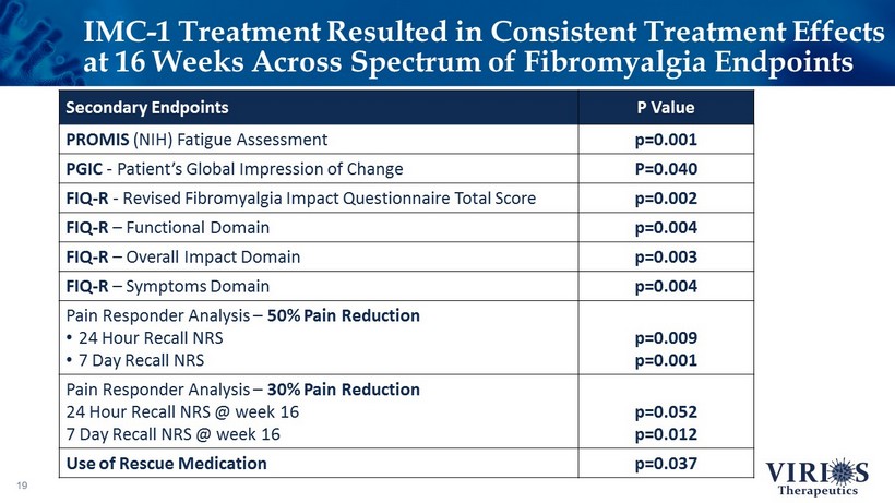 IMC - 1 Demonstrated Statistically Significant Reduction in Pain in Phase 2a Clinical Trial 18 - 1.9 - 2.2 - 1.1 - 0.92 -2.5 -2 -1.5 -1 -0.5 0 NRS 24-hour Recall FIQ-R 7-day Recall IMC - 1 Placebo p = 0.031 p = 0.001 Decrease in Pain Analysis at 16 Week Endpoint