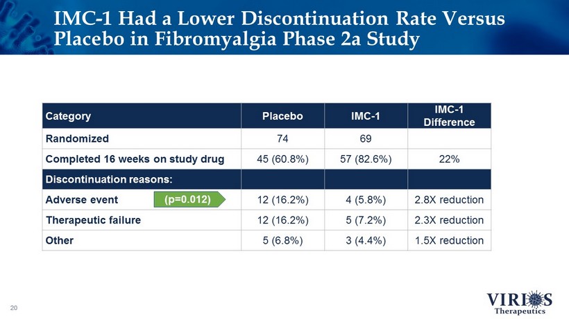 IMC - 1 Treatment Resulted in Consistent Treatment Effects at 16 Weeks Across Spectrum of Fibromyalgia Endpoints 19 Secondary Endpoints P Value PROMIS (NIH) Fatigue Assessment p=0.001 PGIC - Patient’s Global Impression of Change P=0.040 FIQ - R - Revised Fibromyalgia Impact Questionnaire Total Score p=0.002 FIQ - R – Functional Domain p=0.004 FIQ - R – Overall Impact Domain p=0.003 FIQ - R – Symptoms Domain p=0.004 Pain Responder Analysis – 50% Pain Reduction • 24 Hour Recall NRS • 7 Day Recall NRS p=0.009 p=0.001 Pain Responder Analysis – 30% Pain Reduction 24 Hour Recall NRS @ week 16 7 Day Recall NRS @ week 16 p=0.052 p=0.012 Use of Rescue Medication p=0.037