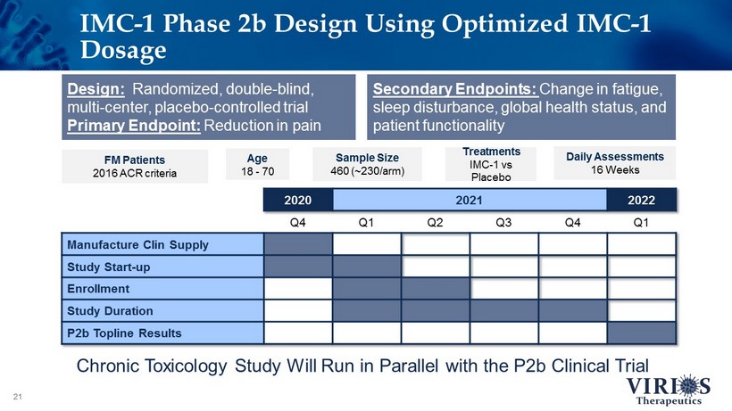 IMC - 1 Had a Lower Discontinuation Rate Versus Placebo in Fibromyalgia Phase 2a Study 20 Category Placebo IMC - 1 IMC - 1 Difference Randomized 74 69 Completed 16 weeks on study drug 45 (60.8%) 57 (82.6%) 22% Discontinuation reasons: Adverse event 12 (16.2%) 4 (5.8%) 2.8X reduction Therapeutic failure 12 (16.2%) 5 (7.2%) 2.3X reduction Other 5 (6.8%) 3 (4.4%) 1.5X reduction (p=0.012)
