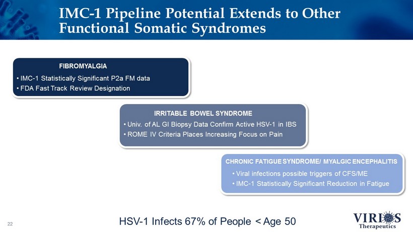 IMC - 1 Phase 2b Design Using Optimized IMC - 1 Dosage 21 Secondary Endpoints: Change in fatigue, sleep disturbance, global health status, and patient functionality FM Patients 2016 ACR criteria Age 18 - 70 Sample Size 460 (~230/arm) Treatments IMC - 1 vs Placebo Daily Assessments 16 Weeks Design: Randomized, double - blind, multi - center, placebo - controlled trial Primary Endpoint: Reduction in pain 2020 2021 2022 Q4 Q1 Q2 Q3 Q4 Q1 Manufacture Clin Supply Study Start - up Enrollment Study Duration P2b Topline Results Chronic Toxicology Study Will Run in Parallel with the P2b Clinical Trial