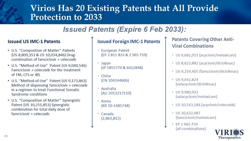 23 Issued Patents (Expire 6 Feb 2033): Virios Has 20 Existing Patents that All Provide Protection to 2033 Issued US IMC - 1 Patents • U.S. “Composition of Matter” Patents (US 8,809,351 & US 10,034,846) Drug - combination of famciclovir + celecoxib • U.S. “Method - of - Use” Patent (US 9,040,546) Famciclovir + celecoxib for the treatment of FM, CFS or IBS • U.S. “Method - of - Use” Patent (US 9,173,863) Method of dispensing famciclovir + celecoxib in a regimen to treat Functional Somatic Syndrome conditions • U.S. “Composition of Matter” Synergistic Patent (US 10,251,853) Synergistic combination for total daily dose of famciclovir + celecoxib Issued Foreign IMC - 1 Patents • European Patent (EP 2 811 833 & 2 965 759) • Japan (JP 5855770 & 6422848) • China (CN 104144606) • Australia (AU 2013217110) • Korea (KR 10 - 1485748) • Canada (2,863,812) Patents Covering Other Anti - Viral Combinations • US 9,682,051 (acyclovir/meloxicam) • US 8,623,882 (acyclovir/diclofenac) • US 9,259,405 (famciclovir/diclofenac) • US 9,642,824 (valacyclovir/diclofenac) • US 9,980,932 (valacyclovir/meloxicam) • US 10,543,184 (acyclovir/celecoxib) • US 10,632,087 (famciclovir/meloxicam) • EP 2 965 759 (all combinations)