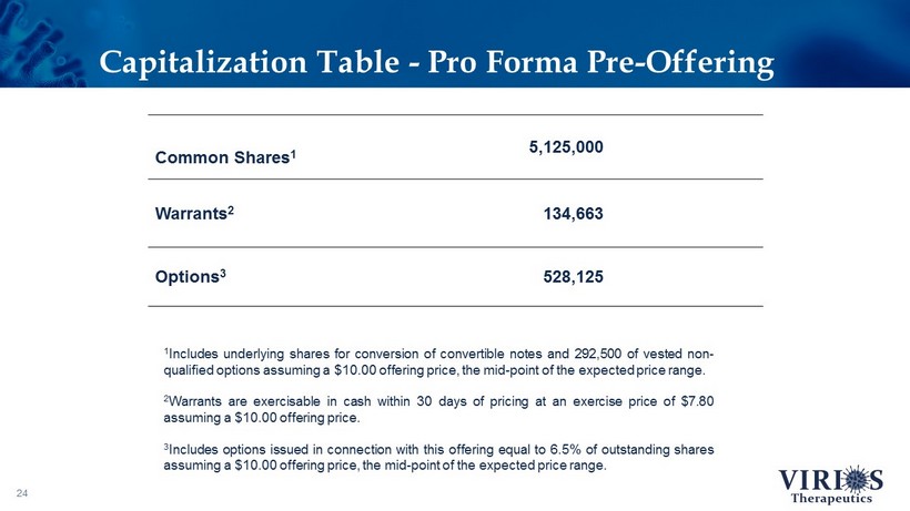 Capitalization Table - Pro Forma Pre - Offering 24 Common Shares 1 5,125,000 Warrants 2 134,663 Options 3 528,125 1 Includes underlying shares for conversion of convertible notes and 292 , 500 of vested non - qualified options assuming a $ 10 . 00 offering price, the mid - point of the expected price range . 2 Warrants are exercisable in cash within 30 days of pricing at an exercise price of $ 7 . 80 assuming a $ 10 . 00 offering price . 3 Includes options issued in connection with this offering equal to 6 . 5 % of outstanding shares assuming a $ 10 . 00 offering price, the mid - point of the expected price range .
